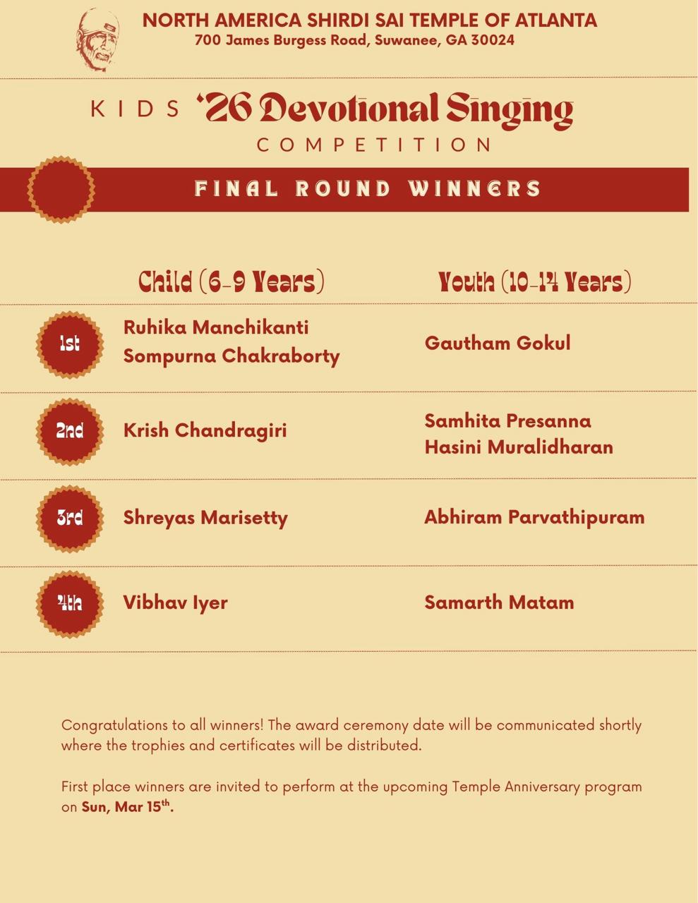 | 17 | Sun | 4:00 PM | Sai Bhajans |